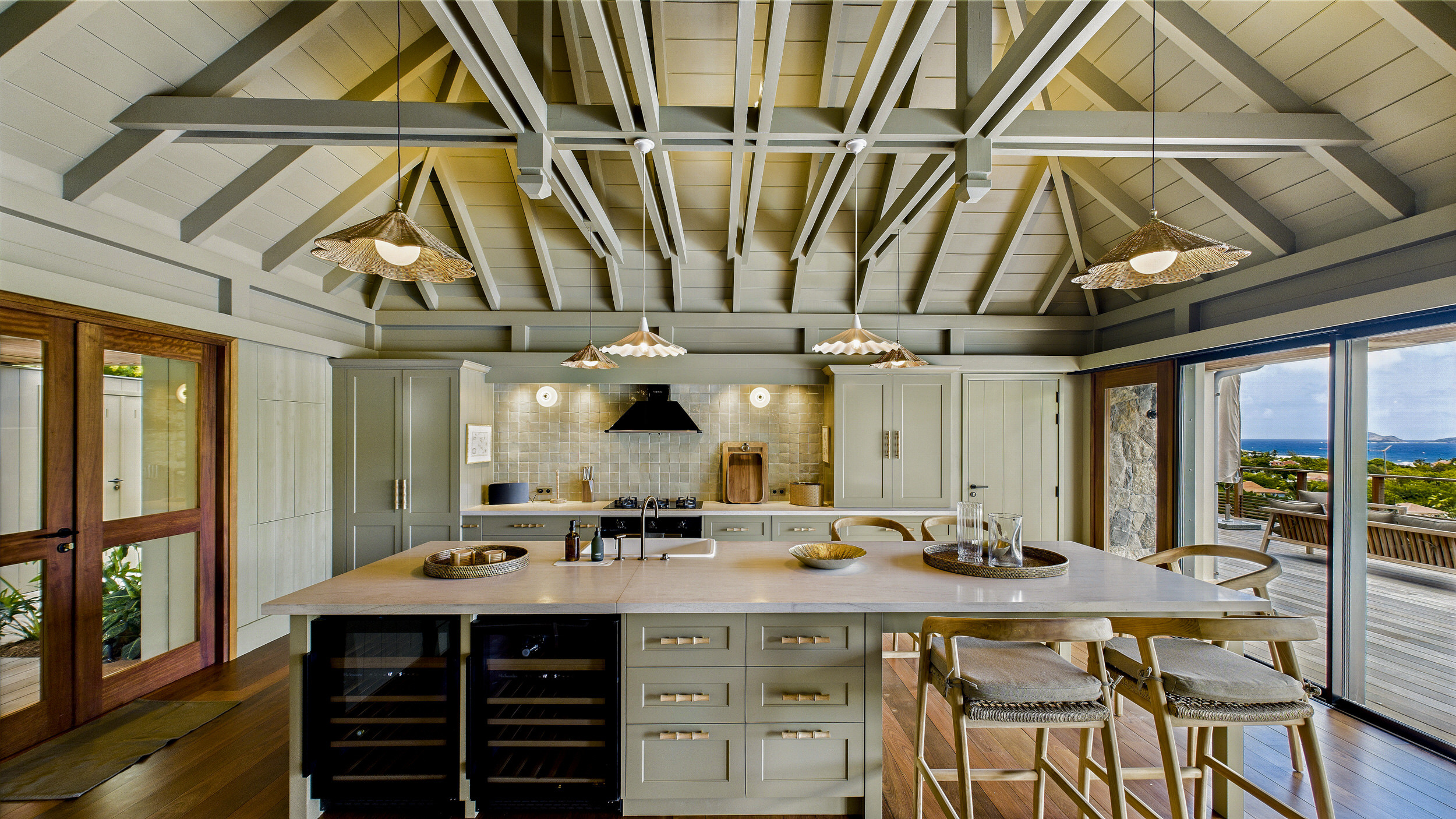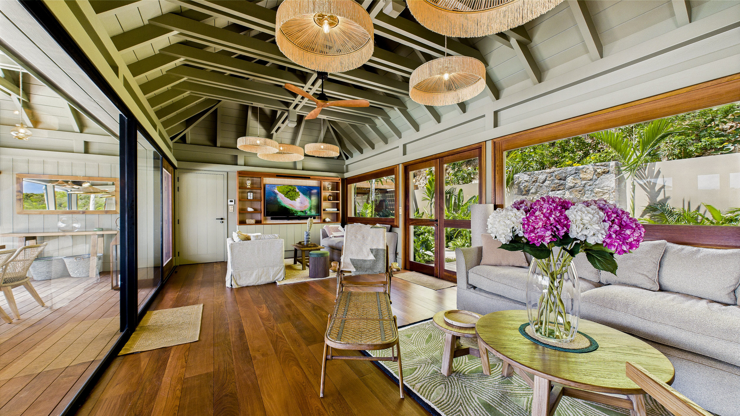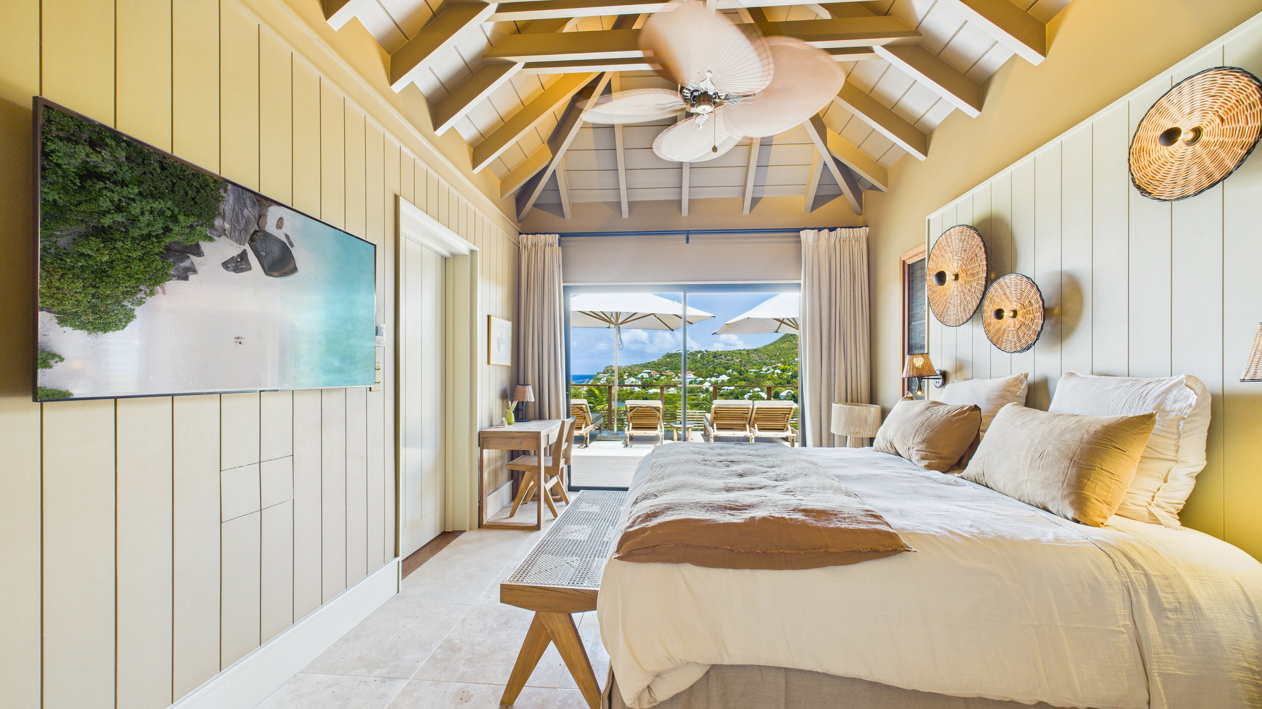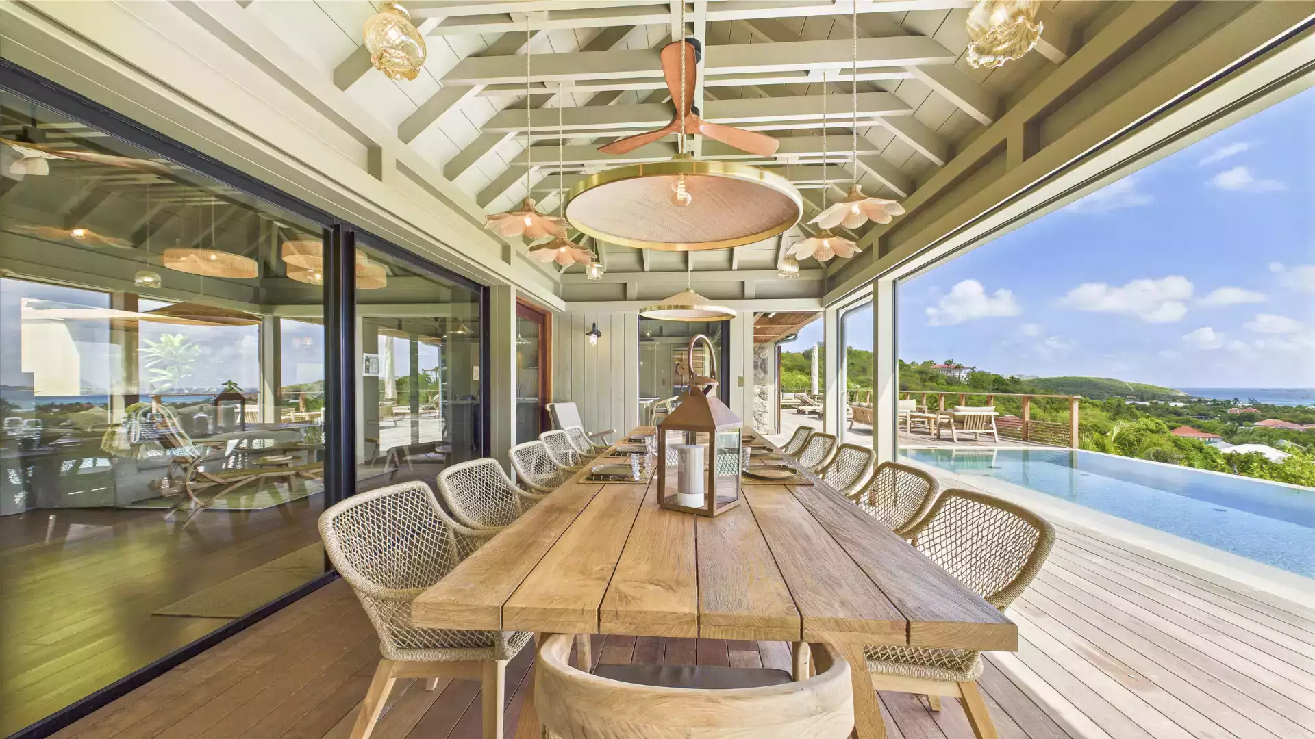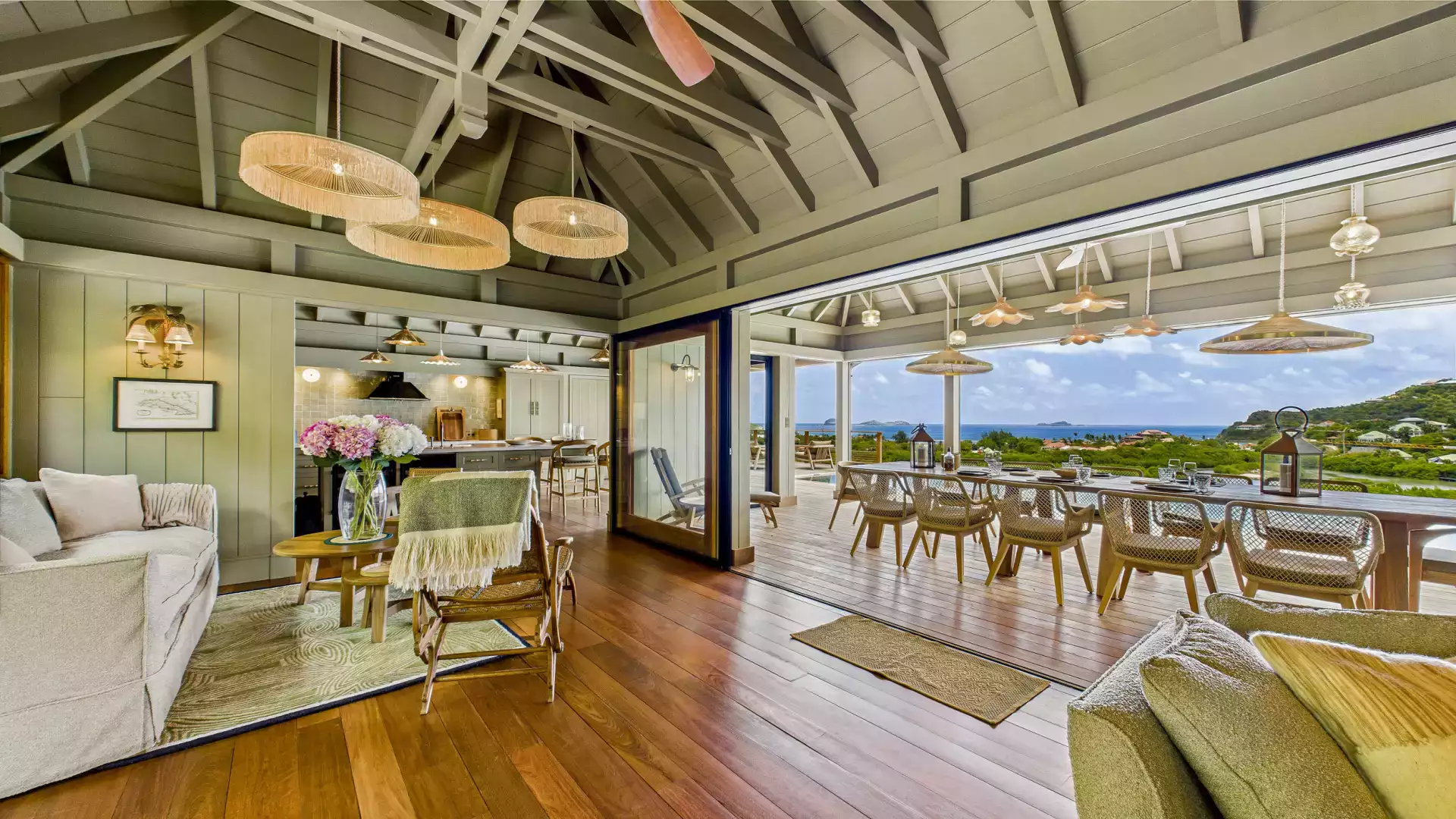 Each bedroom has an ensuite bathroom and outdoor shower, creating a relaxed island vibe. The living areas open entirely to the terrace and heated pools, inviting you to slow down and soak up the panoramic views. Natural wood tones and local design accents add warmth and sophistication throughout.