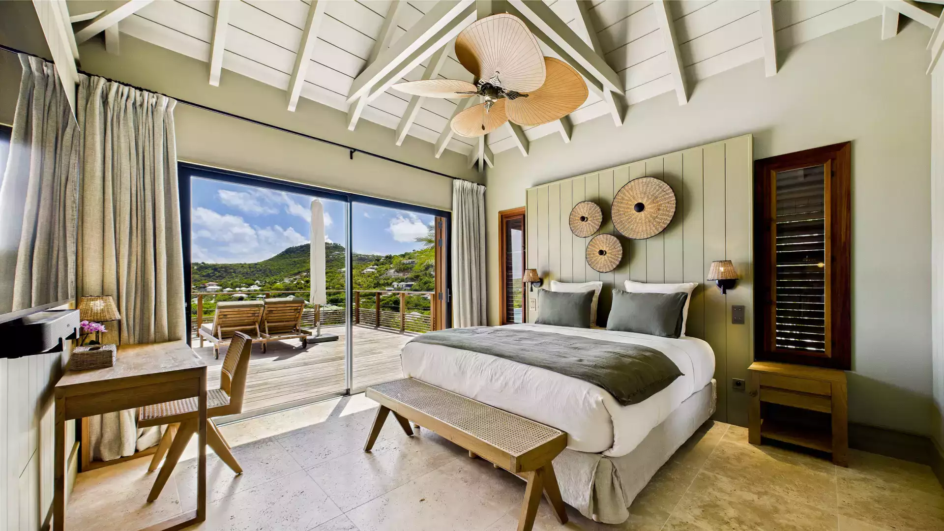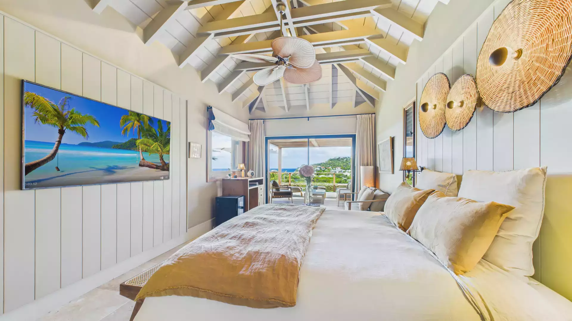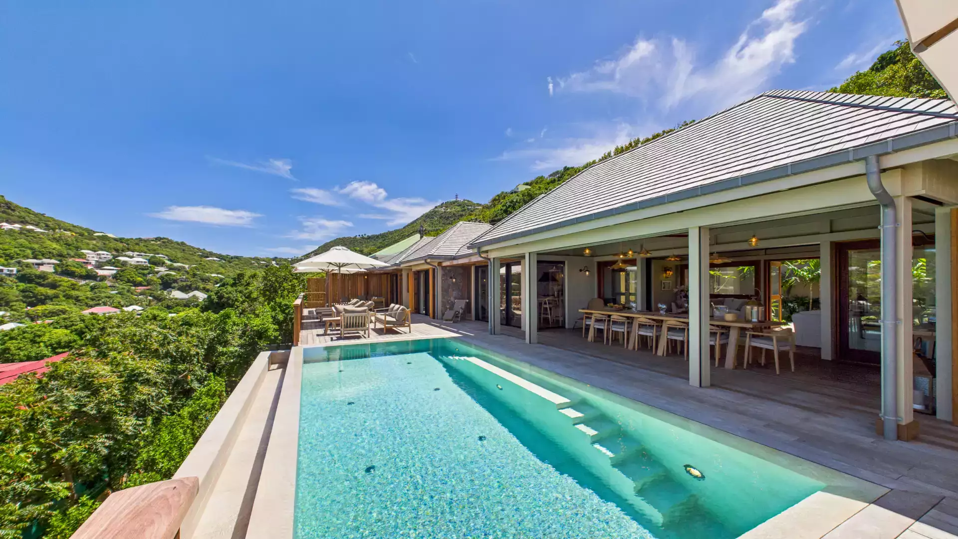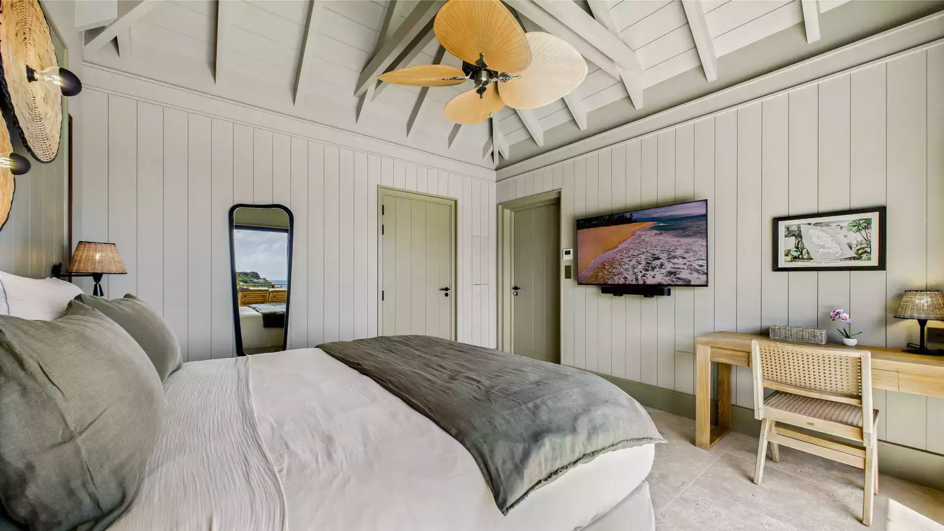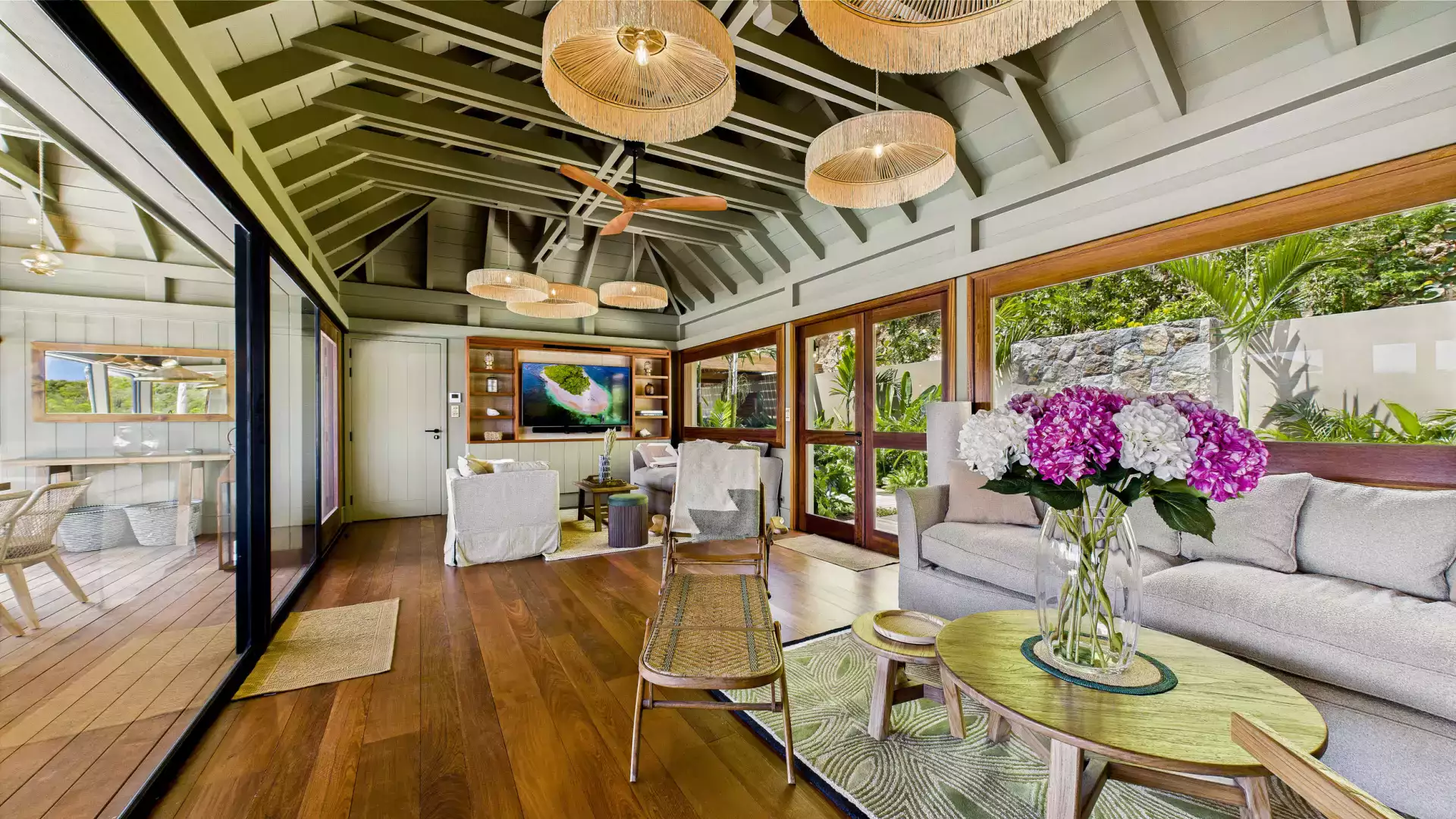 Each bedroom has an ensuite bathroom and outdoor shower, creating a relaxed island vibe. The living areas open entirely to the terrace and heated pools, inviting you to slow down and soak up the panoramic views. Natural wood tones and local design accents add warmth and sophistication throughout.
