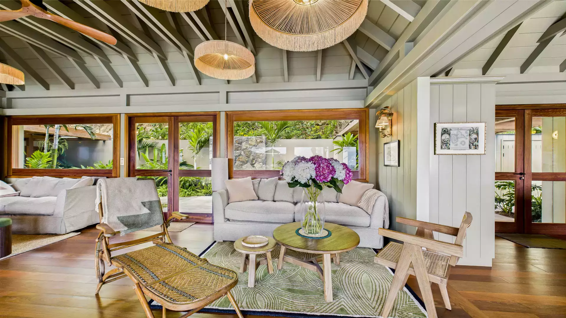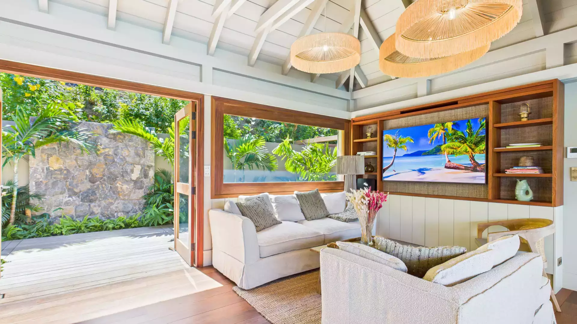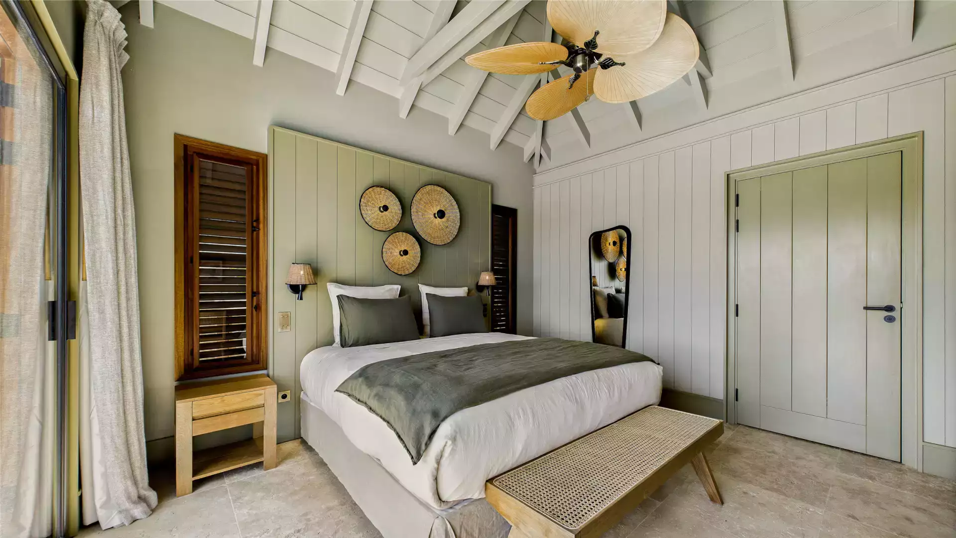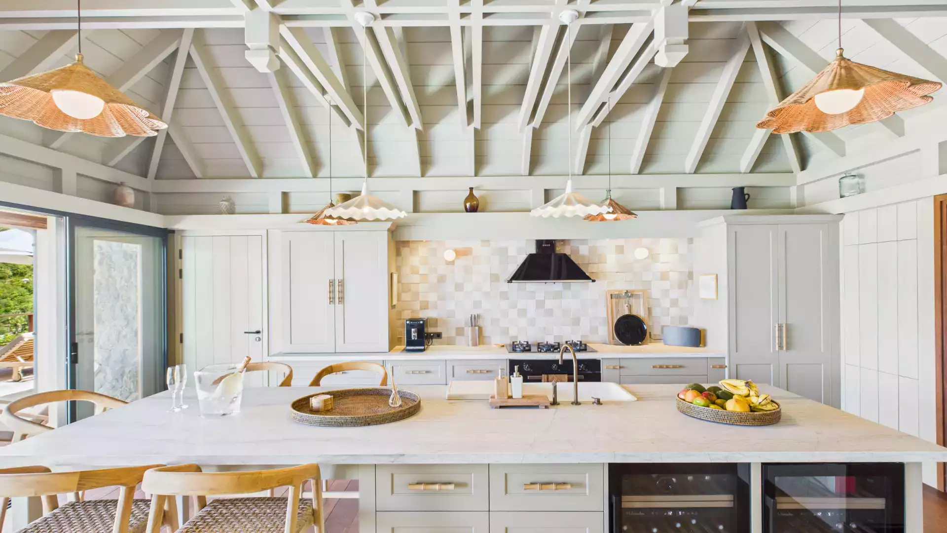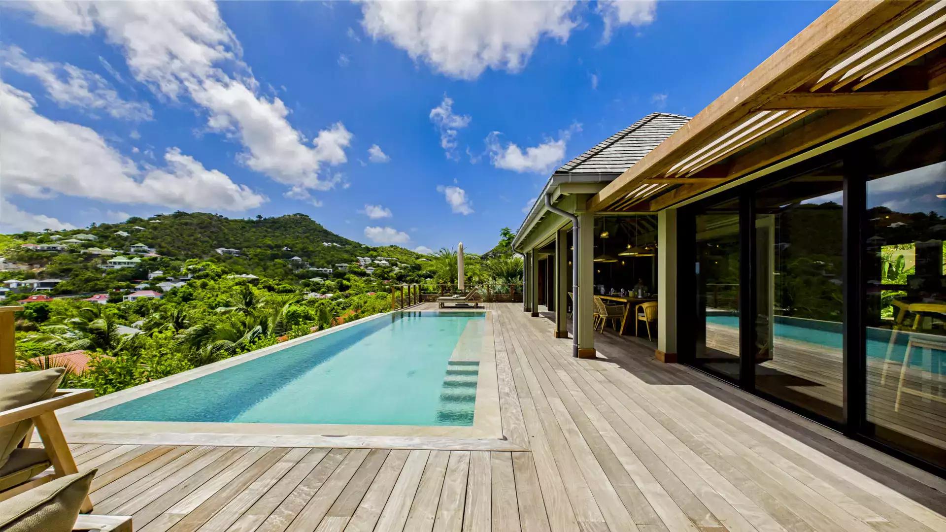 Each bedroom has an ensuite bathroom and outdoor shower, creating a relaxed island vibe. The living areas open entirely to the terrace and heated pools, inviting you to slow down and soak up the panoramic views. Natural wood tones and local design accents add warmth and sophistication throughout.