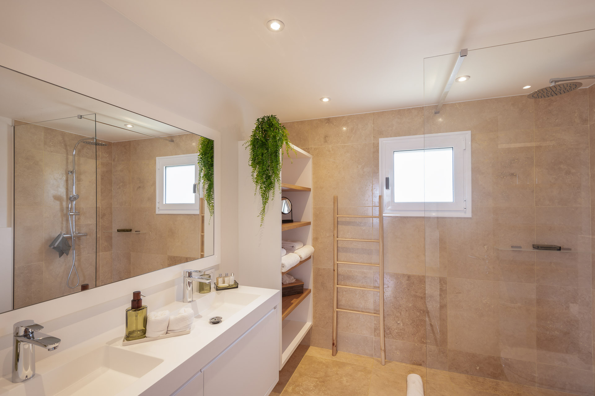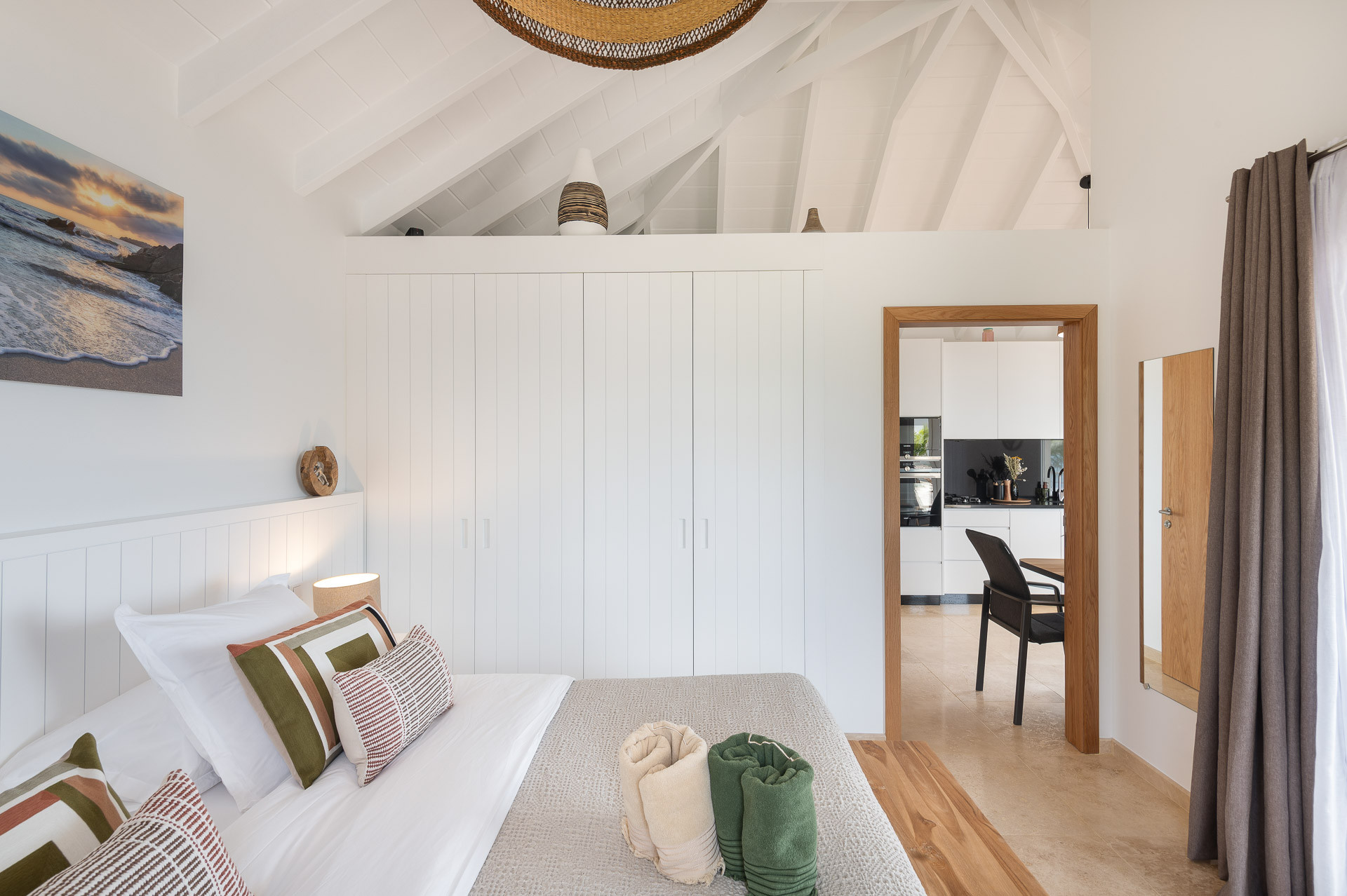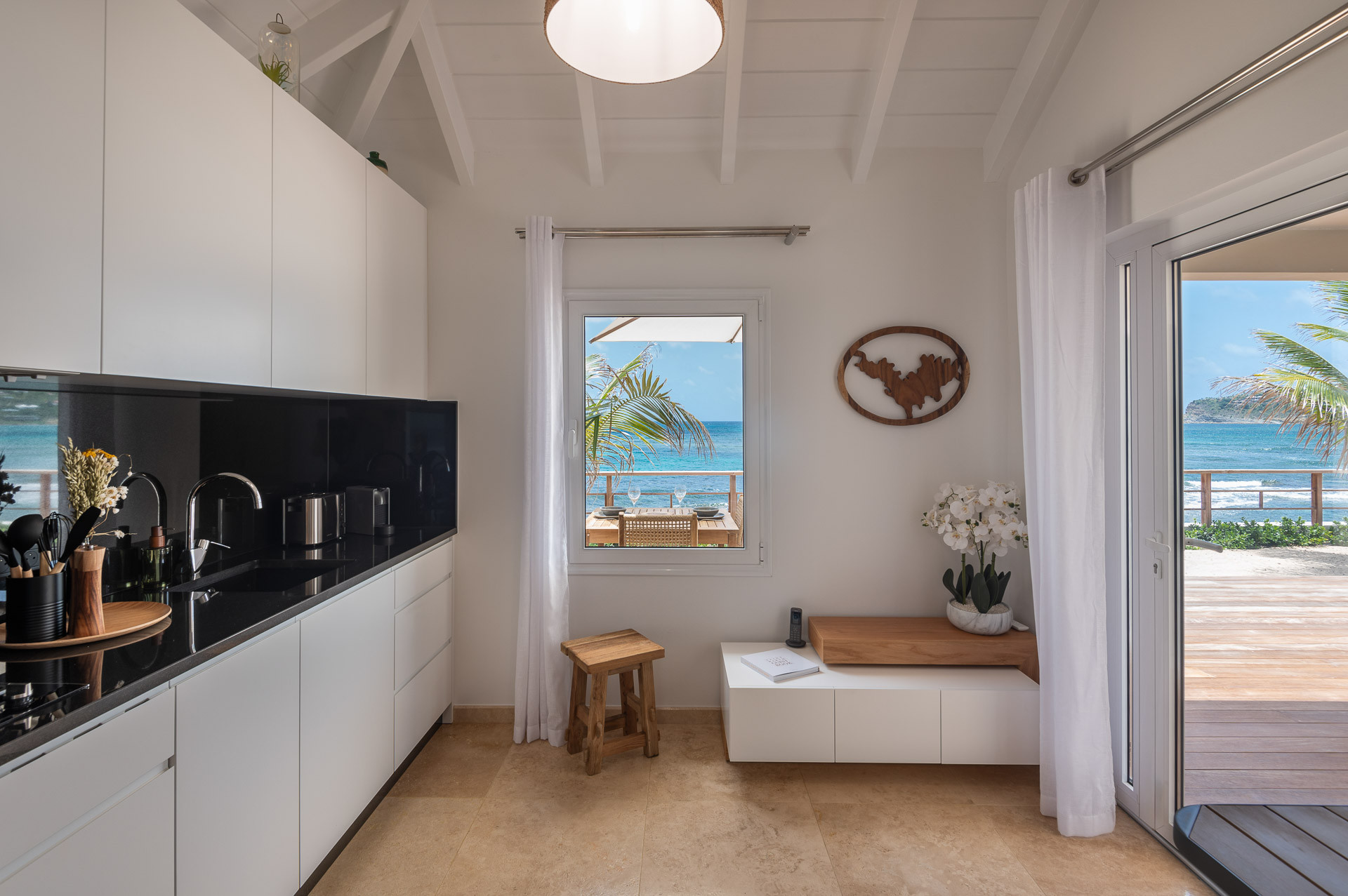 This brand-new, fully air-conditioned villa features elegant decor in light tones. It has a modern, fully equipped kitchen with a small dining table for two. Nearby, you'll find the bathroom with a spacious shower.