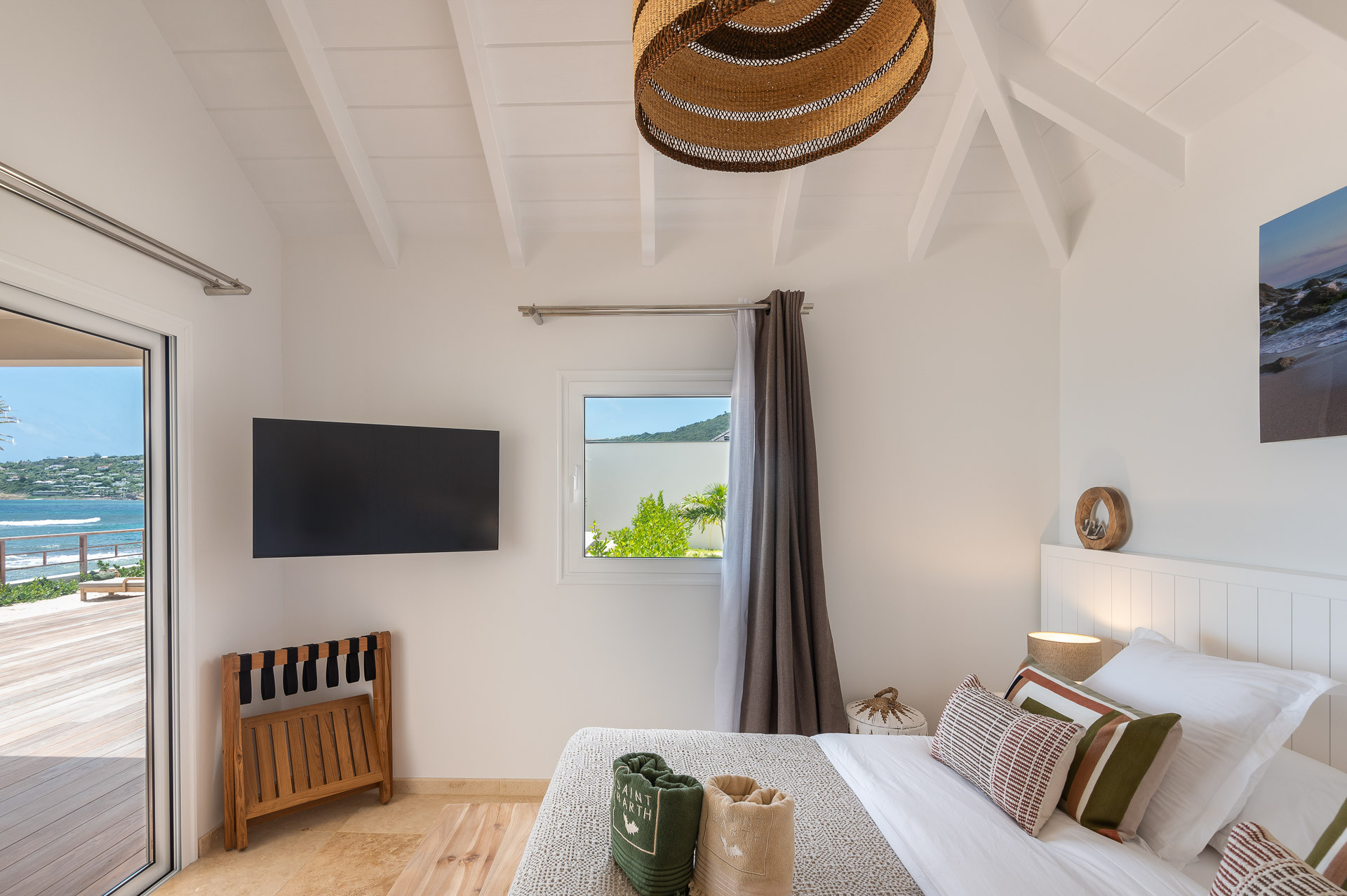 The bedroom includes a large Euro king-size bed and an HDTV, but the highlight is the large glass window offering stunning sea views.
