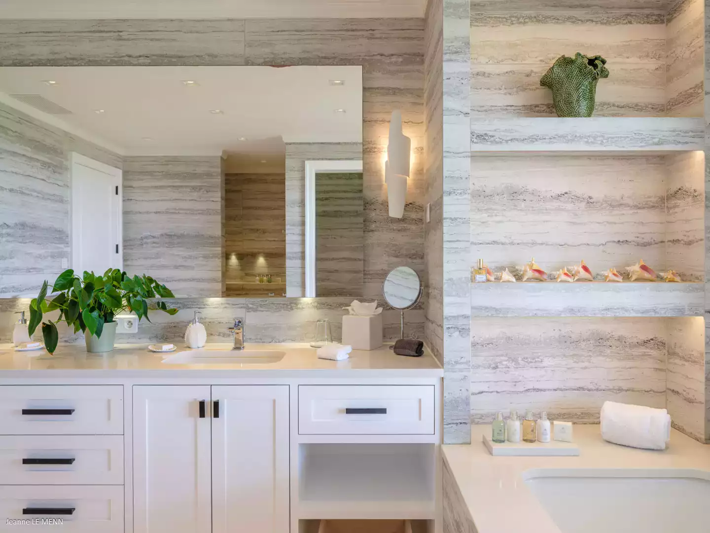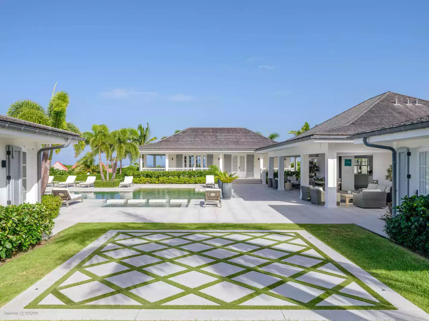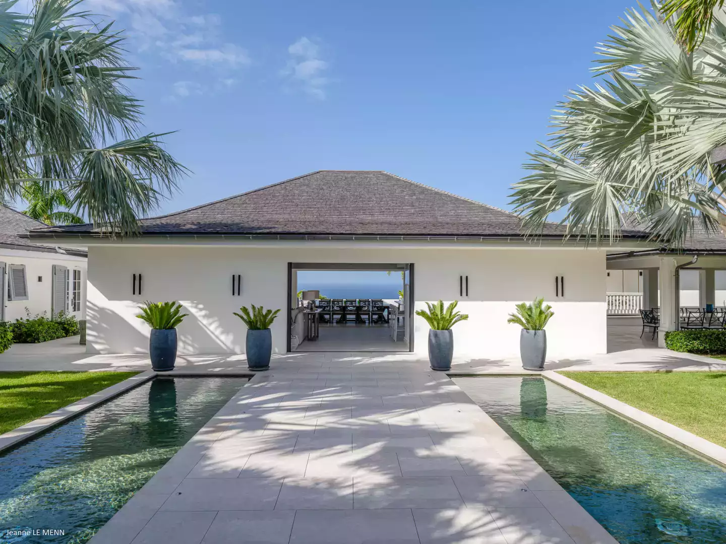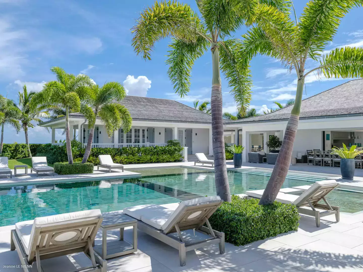 This luxurious villa is bathed in natural light and decorated in elegant, soft tones. It boasts a spacious living room and a fully equipped kitchen, perfect for hosting a private chef to organize a convivial meal. There are two dining areas: one facing the pool and the other, sheltered from the wind, near the barbecue.