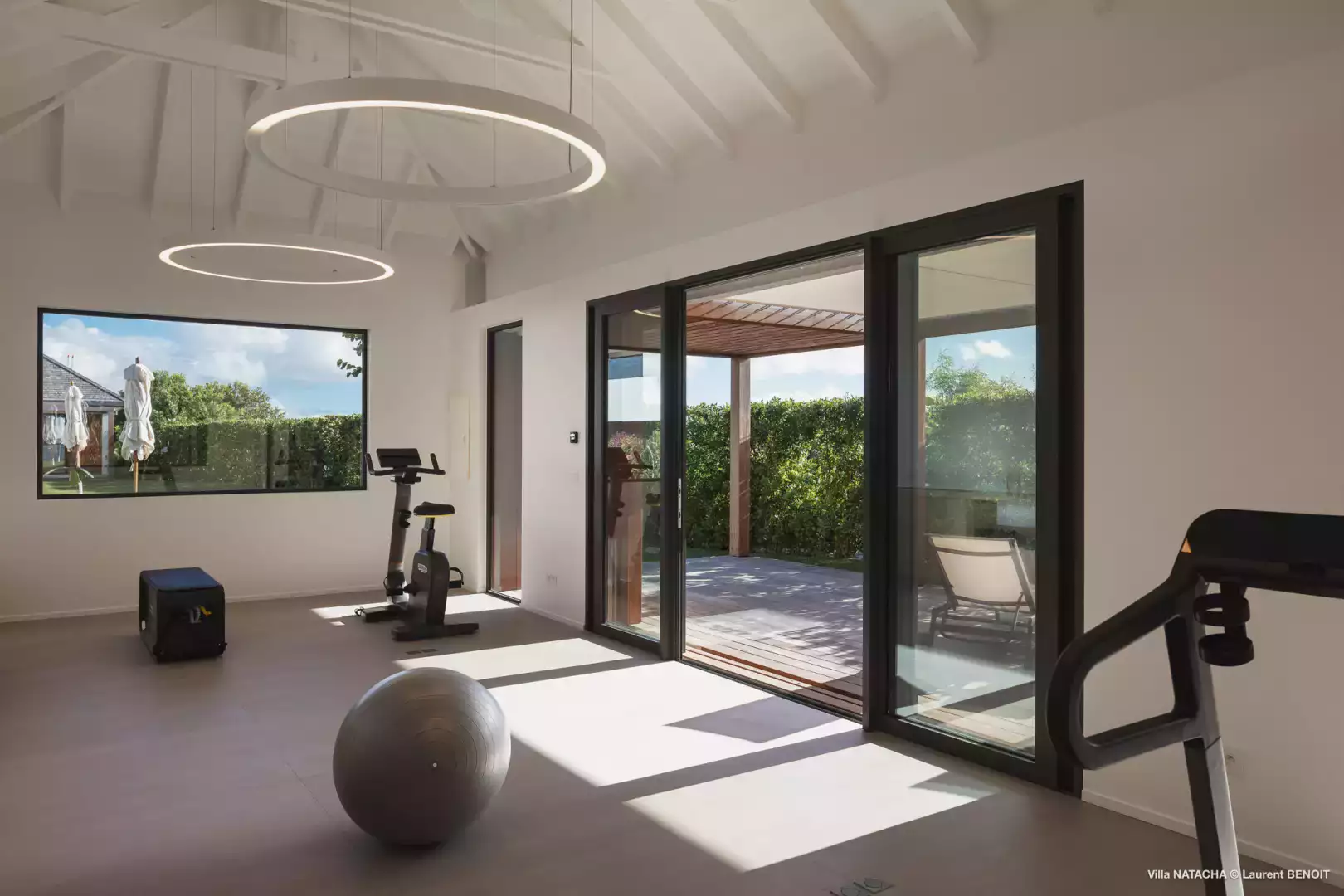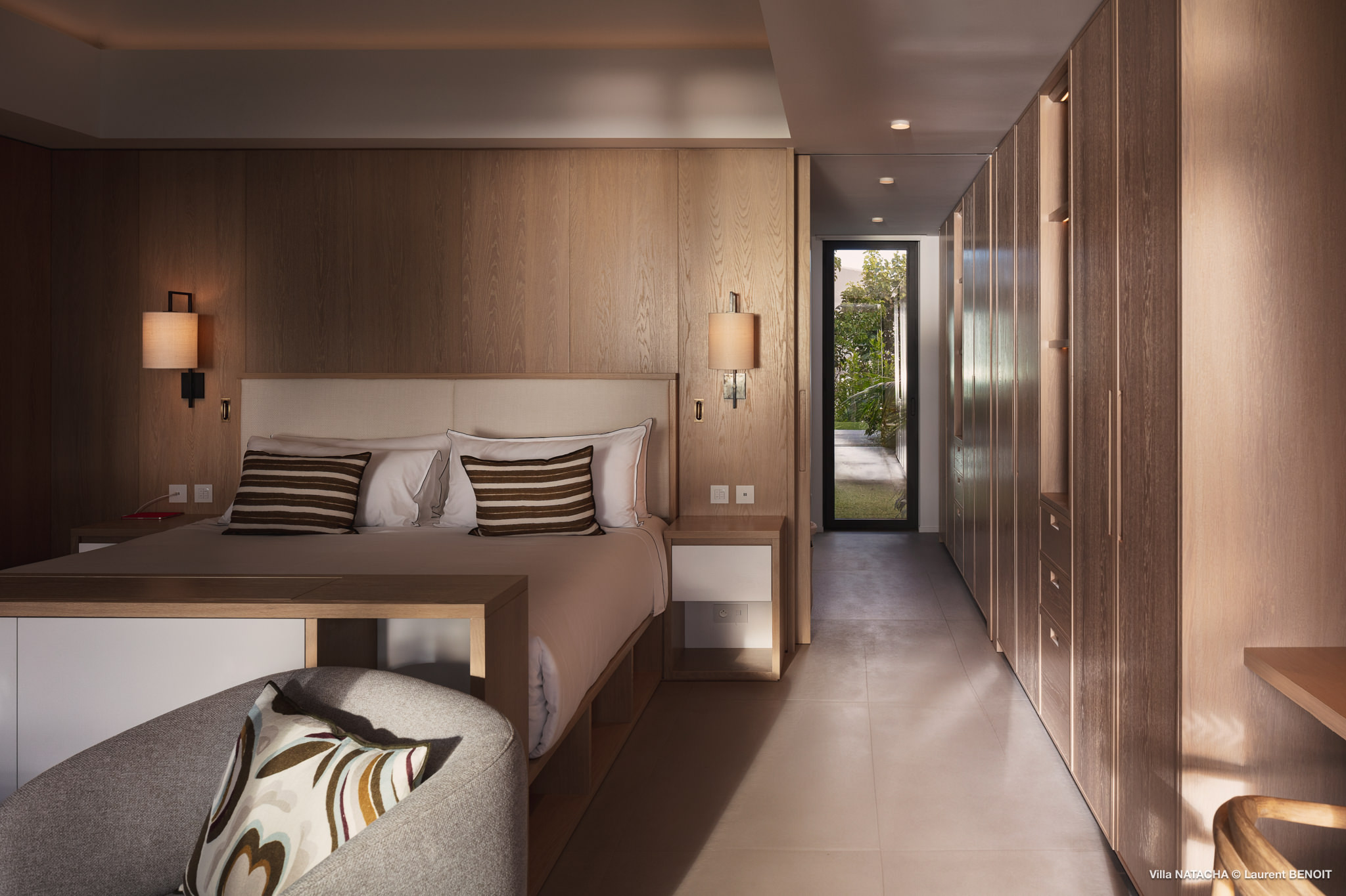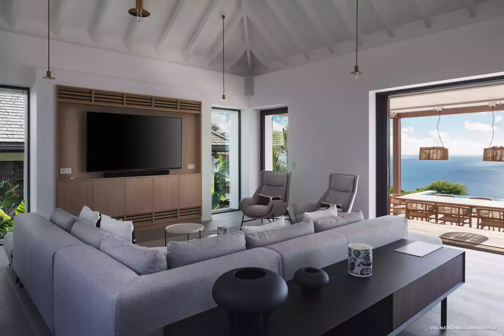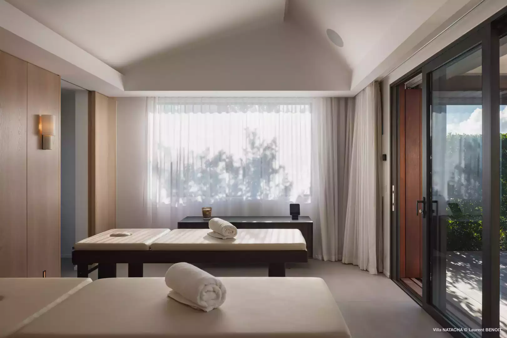 Designed for both relaxation and togetherness, Villa Natacha features spacious living areas with a Sonos sound system, a dining space facing the sea, and a sleek, fully equipped kitchen. Guests can also enjoy a private gym and a dedicated massage room, making wellness part of the experience.