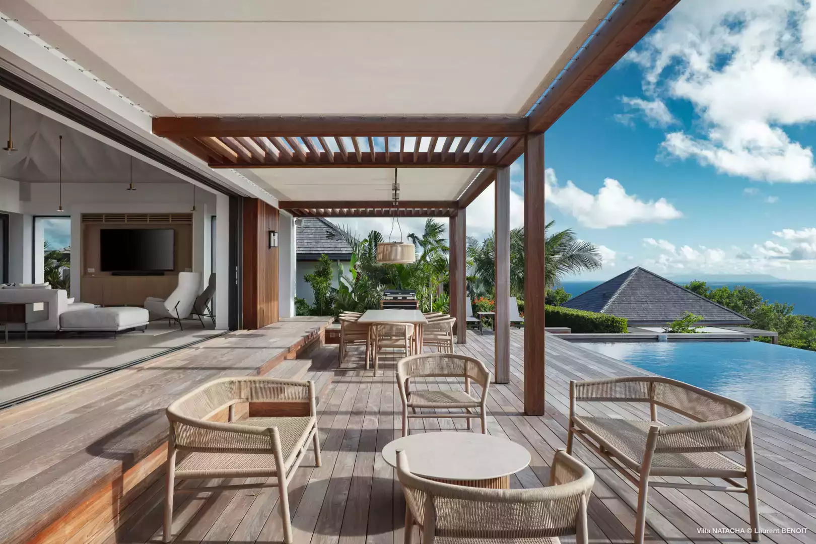 Tucked away in a private estate in Gouverneur, Villa Natacha is a contemporary jewel overlooking the turquoise waters of the Caribbean Sea. From the very first step inside, the open design and natural light create an atmosphere where architecture and nature blend seamlessly. The expansive wooden deck features a heated infinity pool, the perfect spot to soak up the sun or enjoy a magical sunset.