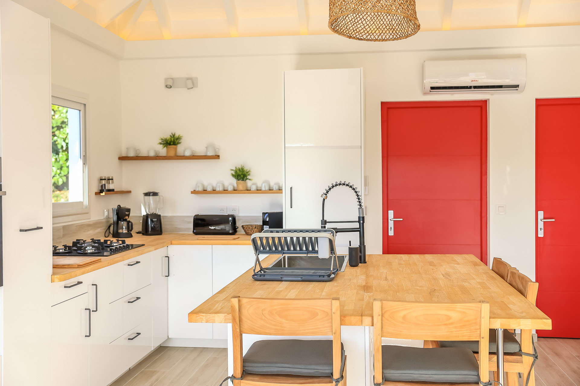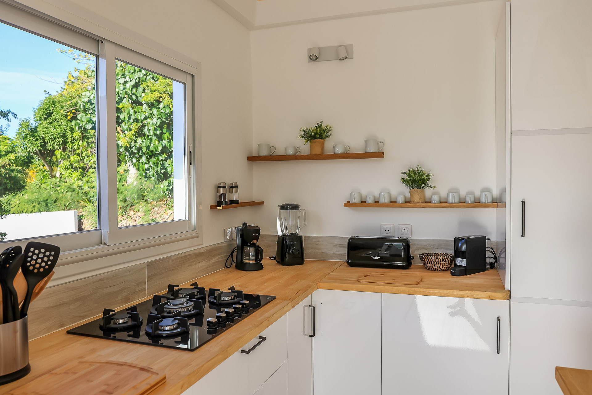 Open to living room, fridge, freezer, dishwasher, oven, microwave oven, filter coffee maker, espresso coffee maker, toaster, kettle, juicer, blender