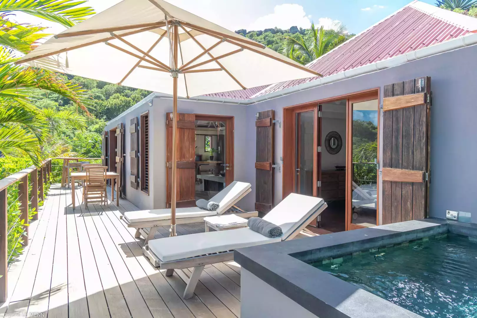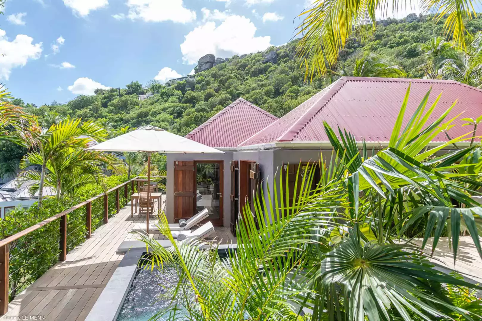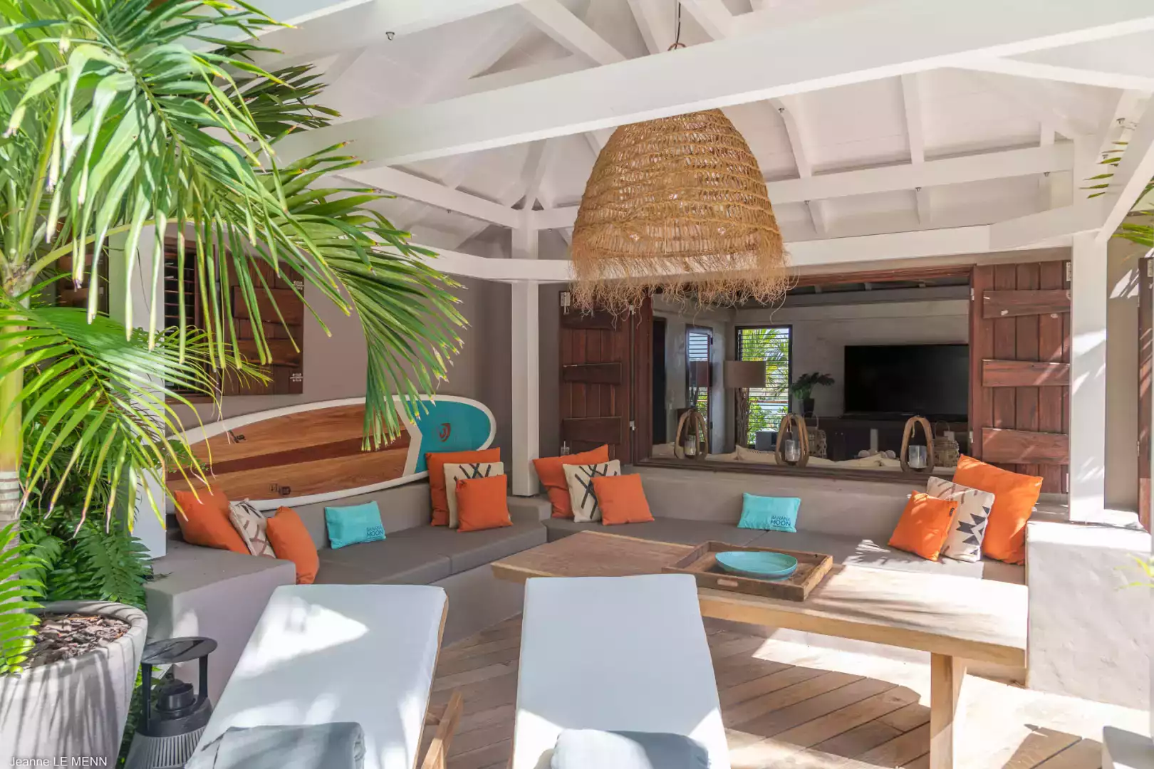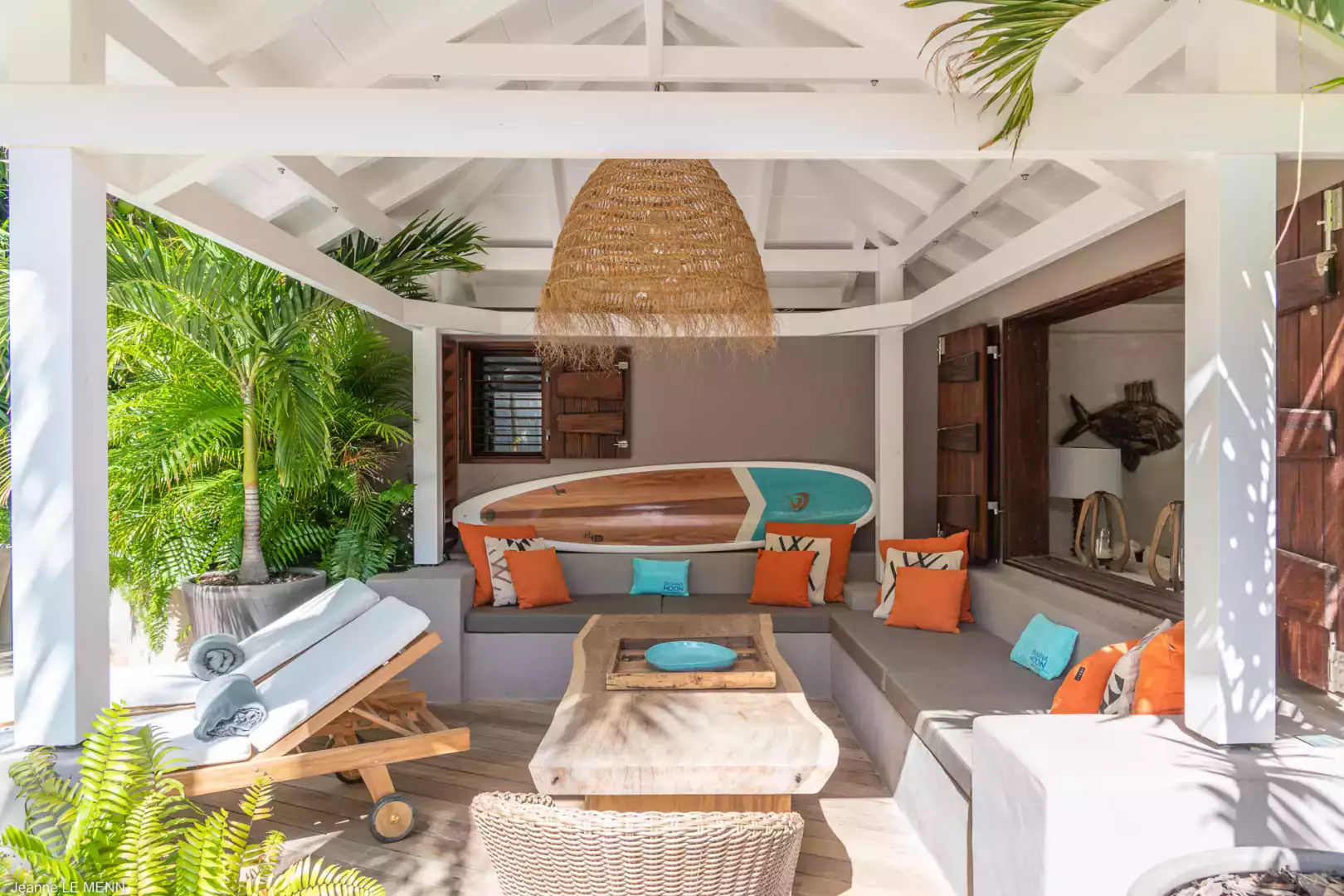 Tucked away in the serene setting of Grand Cul de Sac, Villa Ti Rock offers a chic tropical retreat for your next St. Barth getaway. As you enter the property from the back, you’re greeted by a beautiful outdoor space, complete with a refreshing pool and a comfortable lounge area perfect for soaking in the island atmosphere.