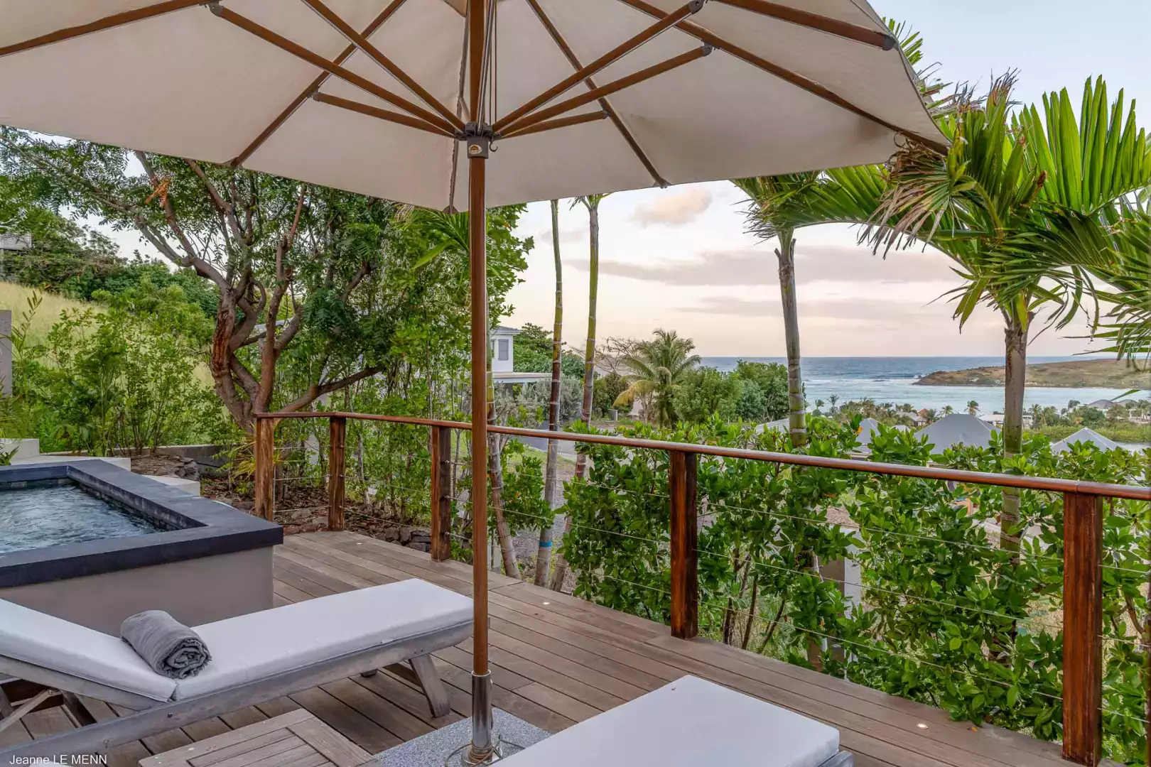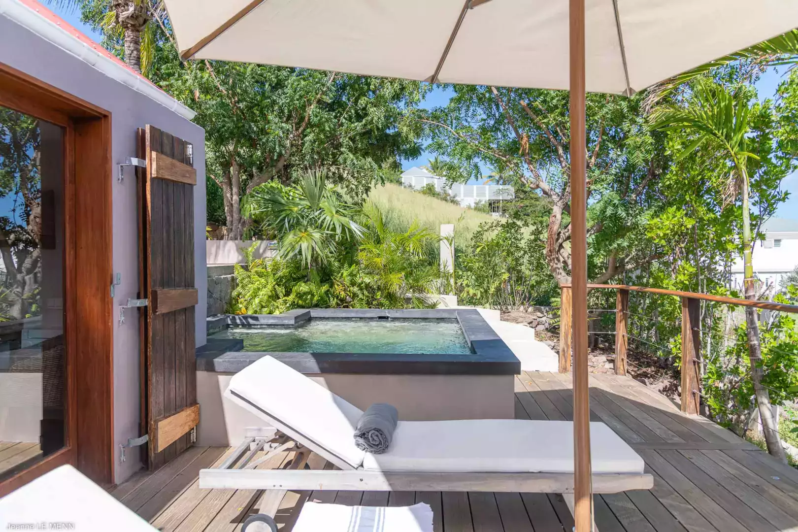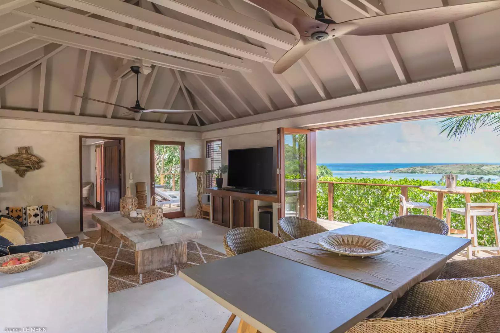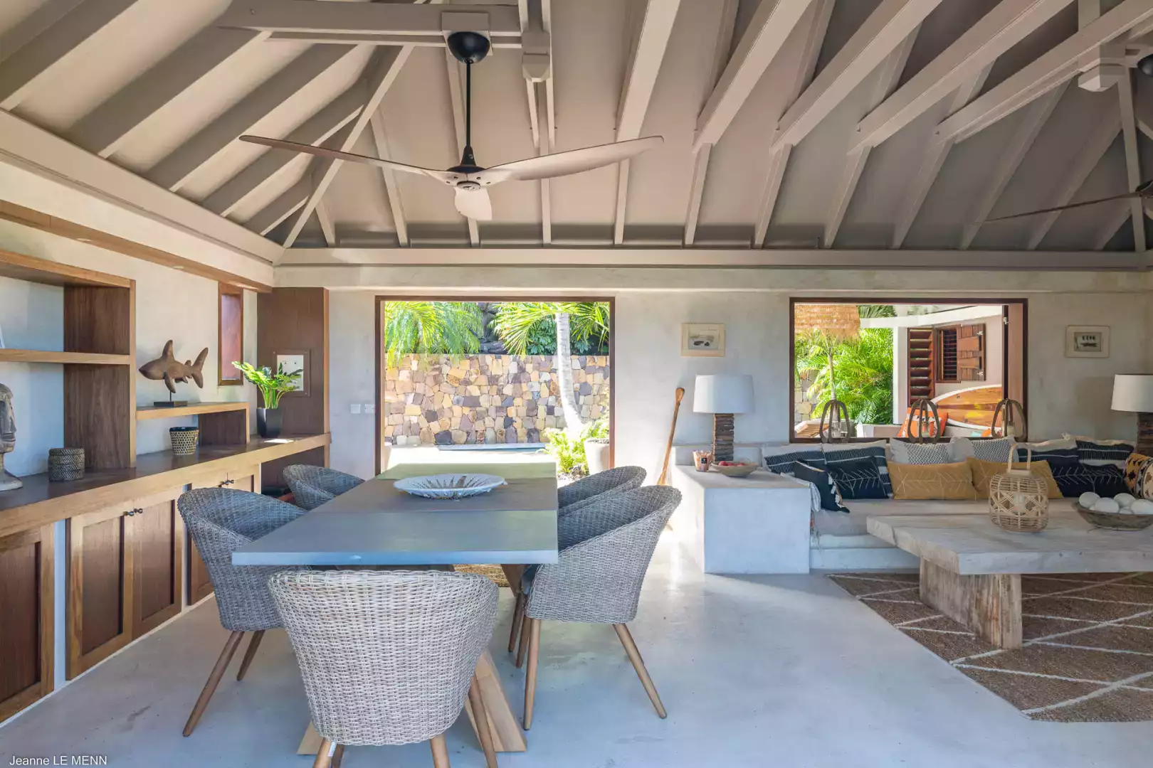 Tucked away in the serene setting of Grand Cul de Sac, Villa Ti Rock offers a chic tropical retreat for your next St. Barth getaway. As you enter the property from the back, you’re greeted by a beautiful outdoor space, complete with a refreshing pool and a comfortable lounge area perfect for soaking in the island atmosphere.