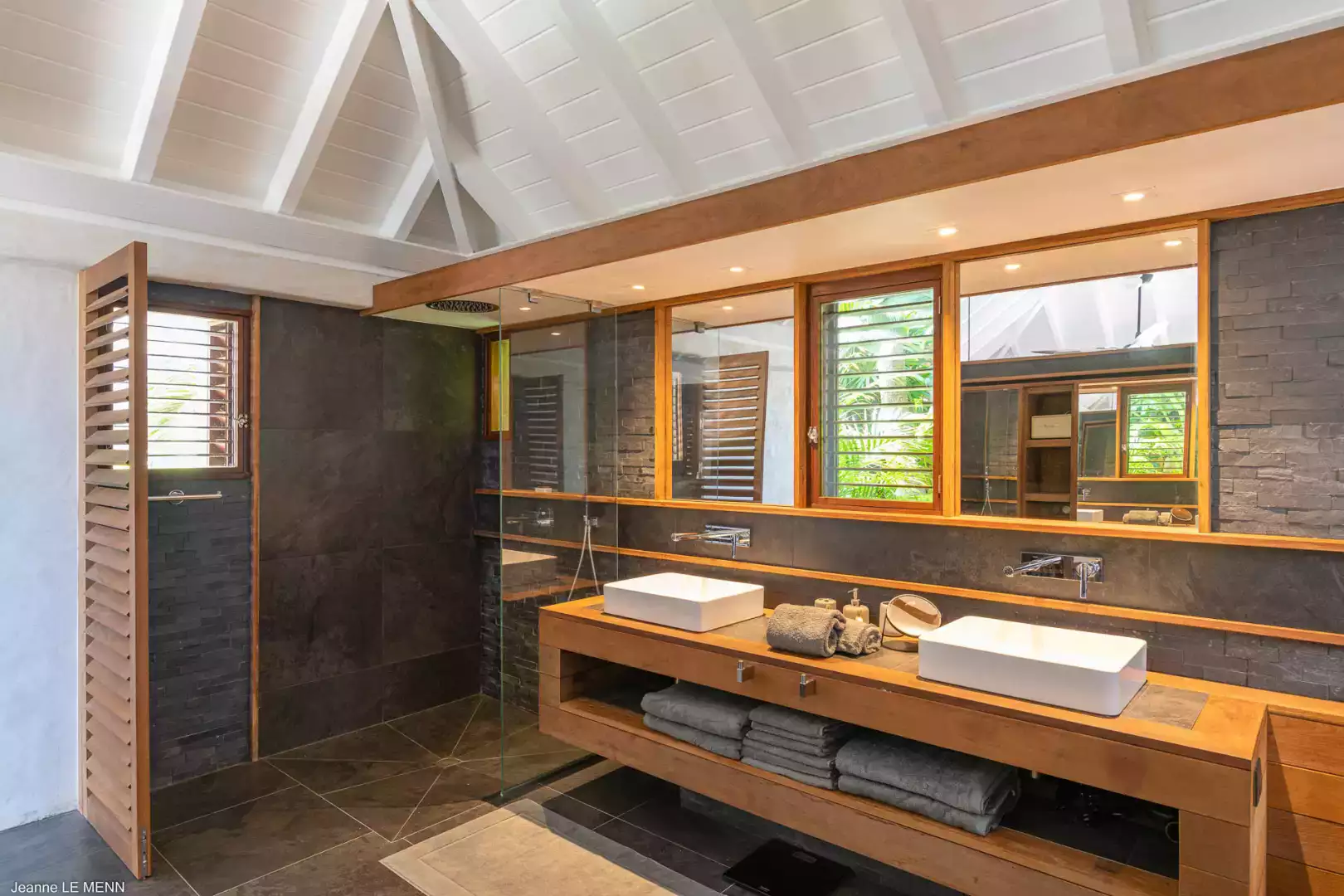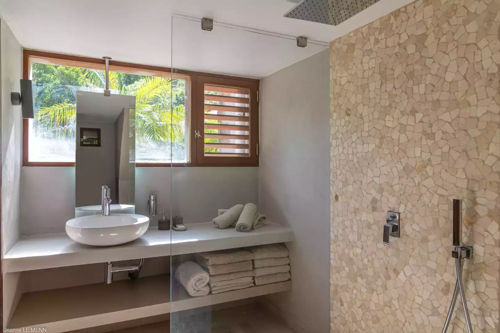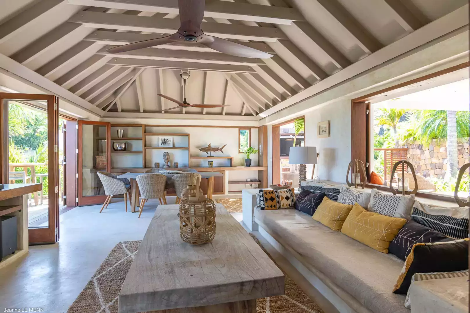 The villa's kitchen, set in its own separate bungalow, provides both privacy and functionality for all your culinary endeavors. Moving into the stylish living room, you’ll find it opens onto a terrace with a small heated pool that faces the picturesque views of the surrounding landscape. The decor throughout the villa is carefully curated, offering a blend of sophistication, island chic, and tropical vibes.