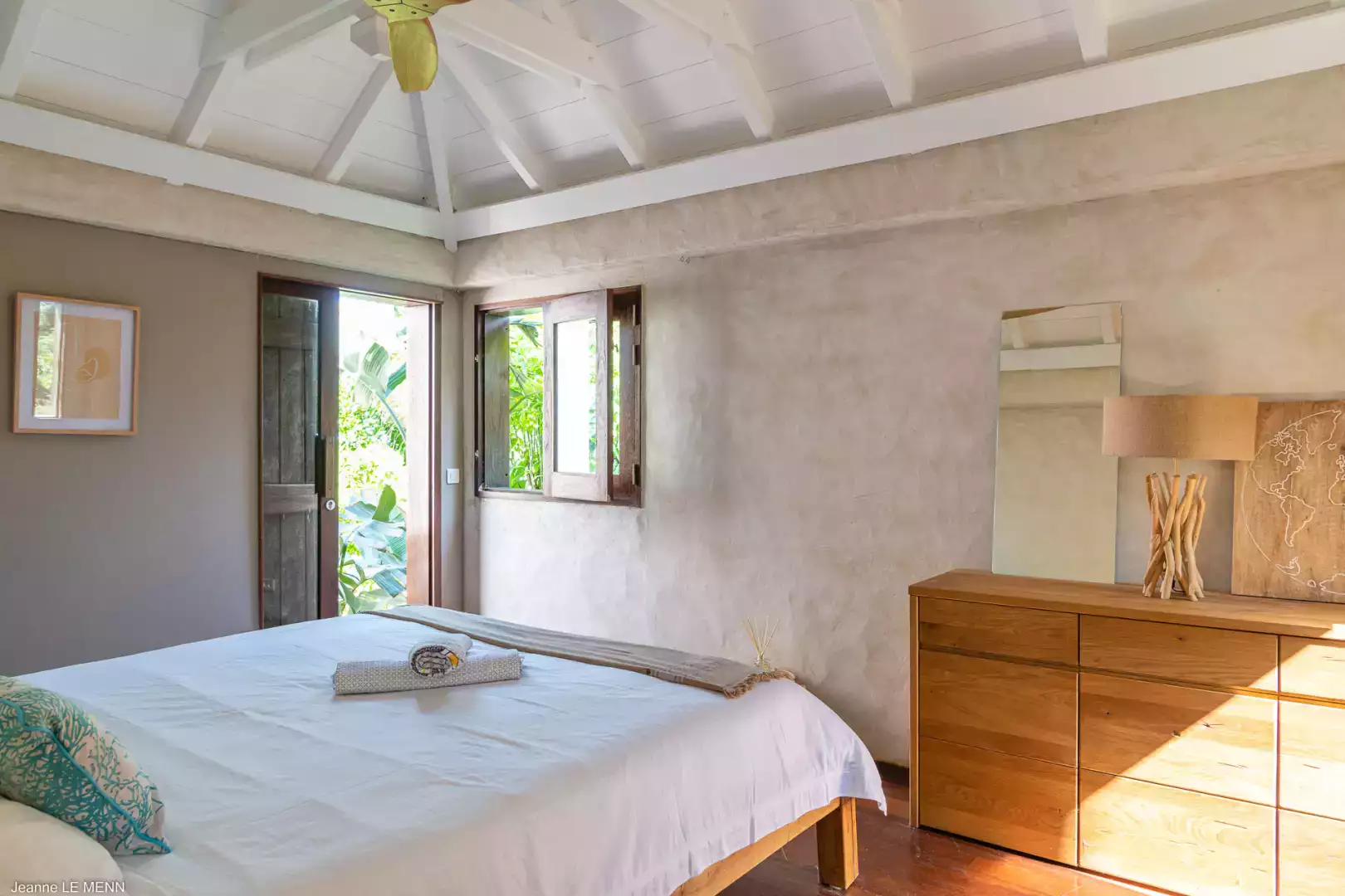 King size bed (160 cm), air-conditioning (A/C), ceiling fan, ensuite bathroom with shower and toilet, hairdryer, safe. Located on a separate bungalow