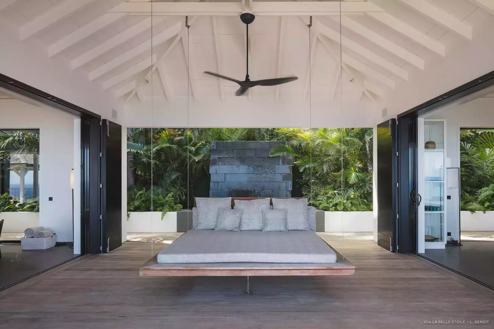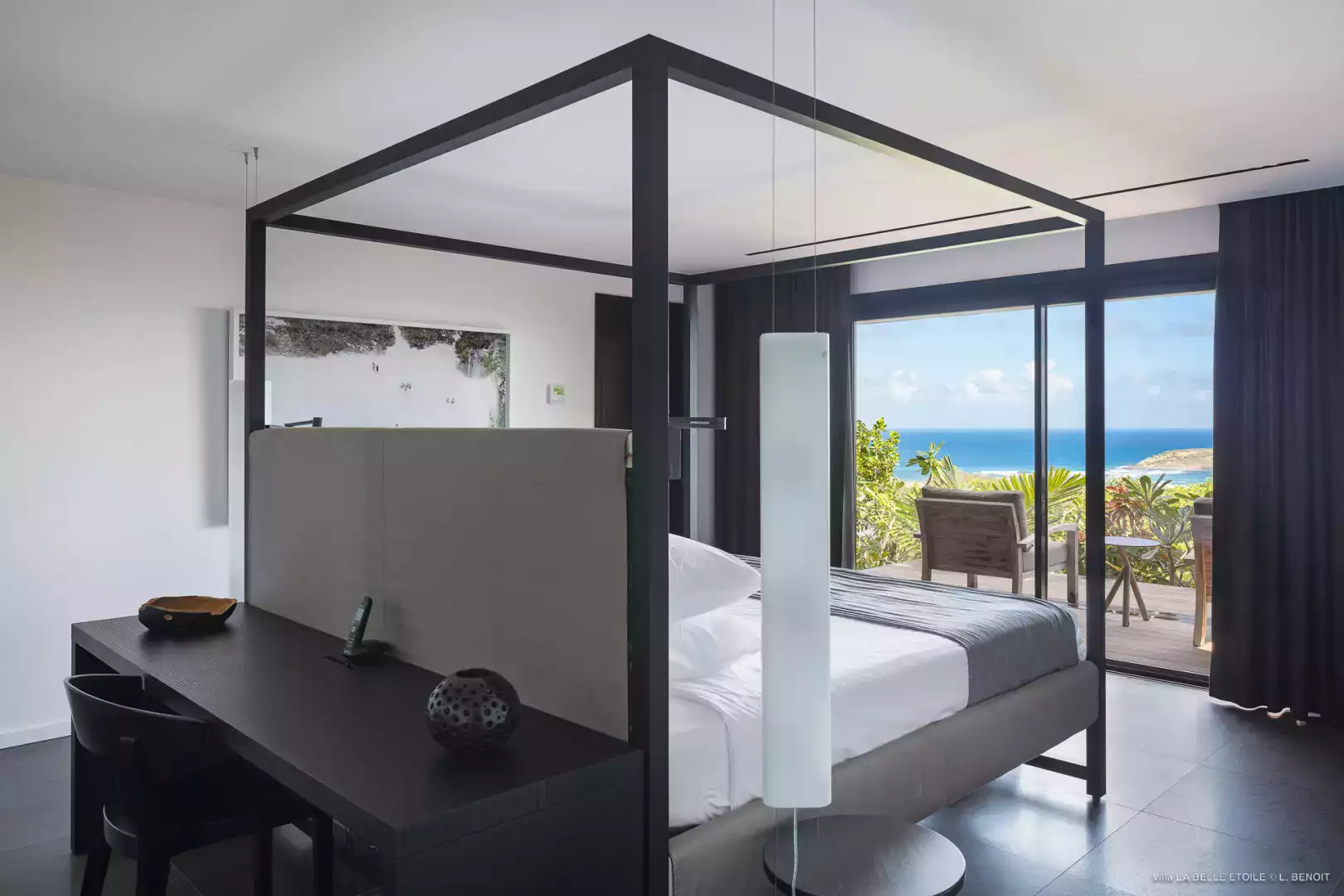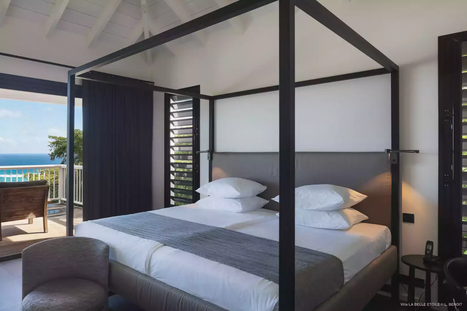 Lit King size (180 cm), climatisation (A/C), vue mer, TV (satellite américain), Apple TV, Sonos, salle de bain adjacente avec douche et toilettes, moustiquaires aux baies, sèche-cheveux, coffre fort. La Chambre 5 communique avec la Chambre 4 par les salles de bain.