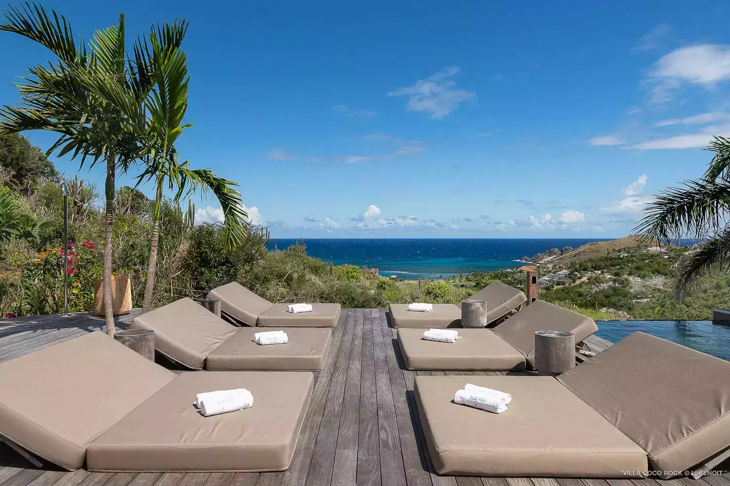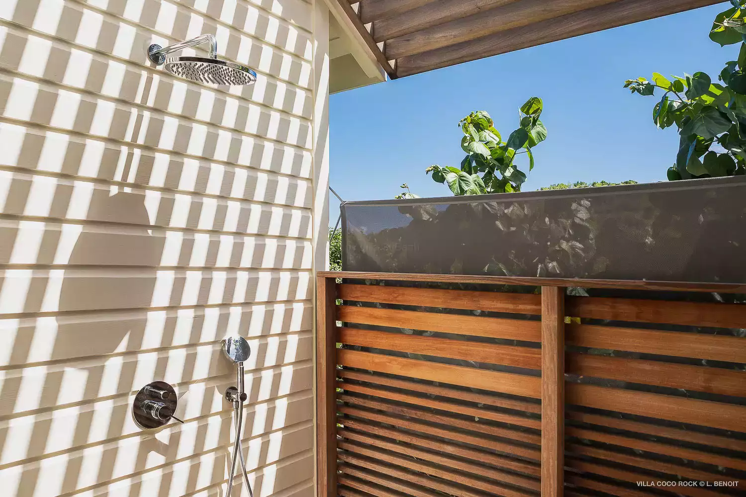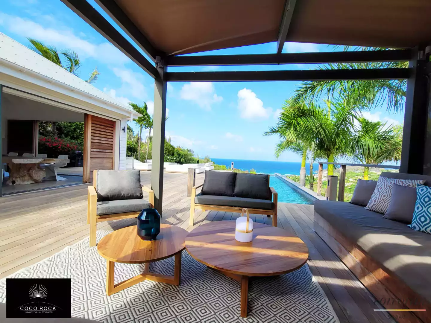 L’espace extérieur de la Villa Coco Rock est un véritable havre de paix, avec une vaste terrasse aménagée, une piscine chauffée et un salon extérieur confortable, offrant une jolie vue sur la mer.