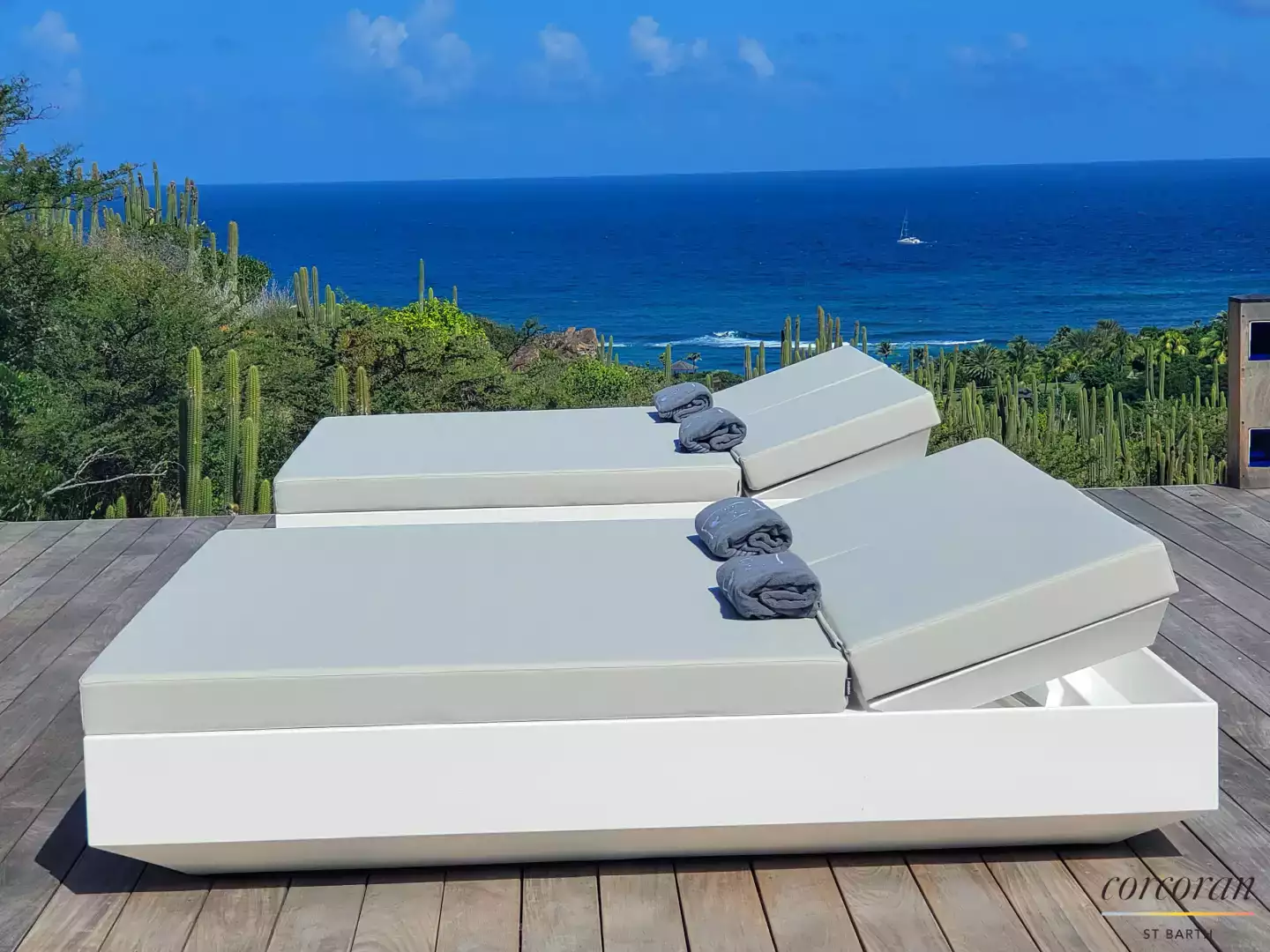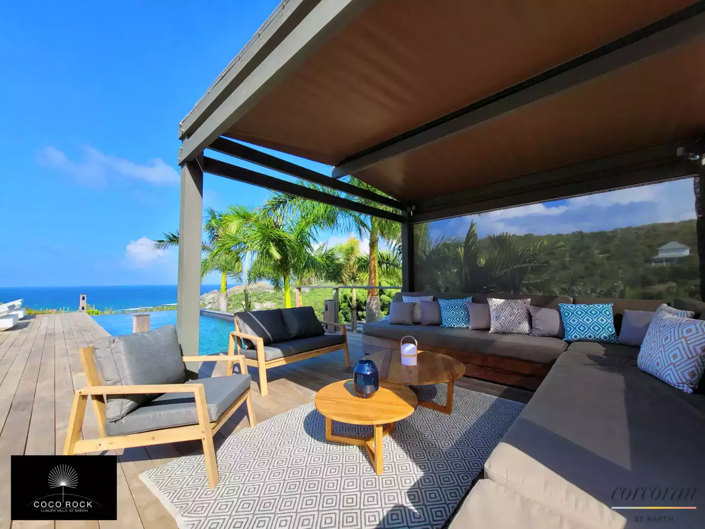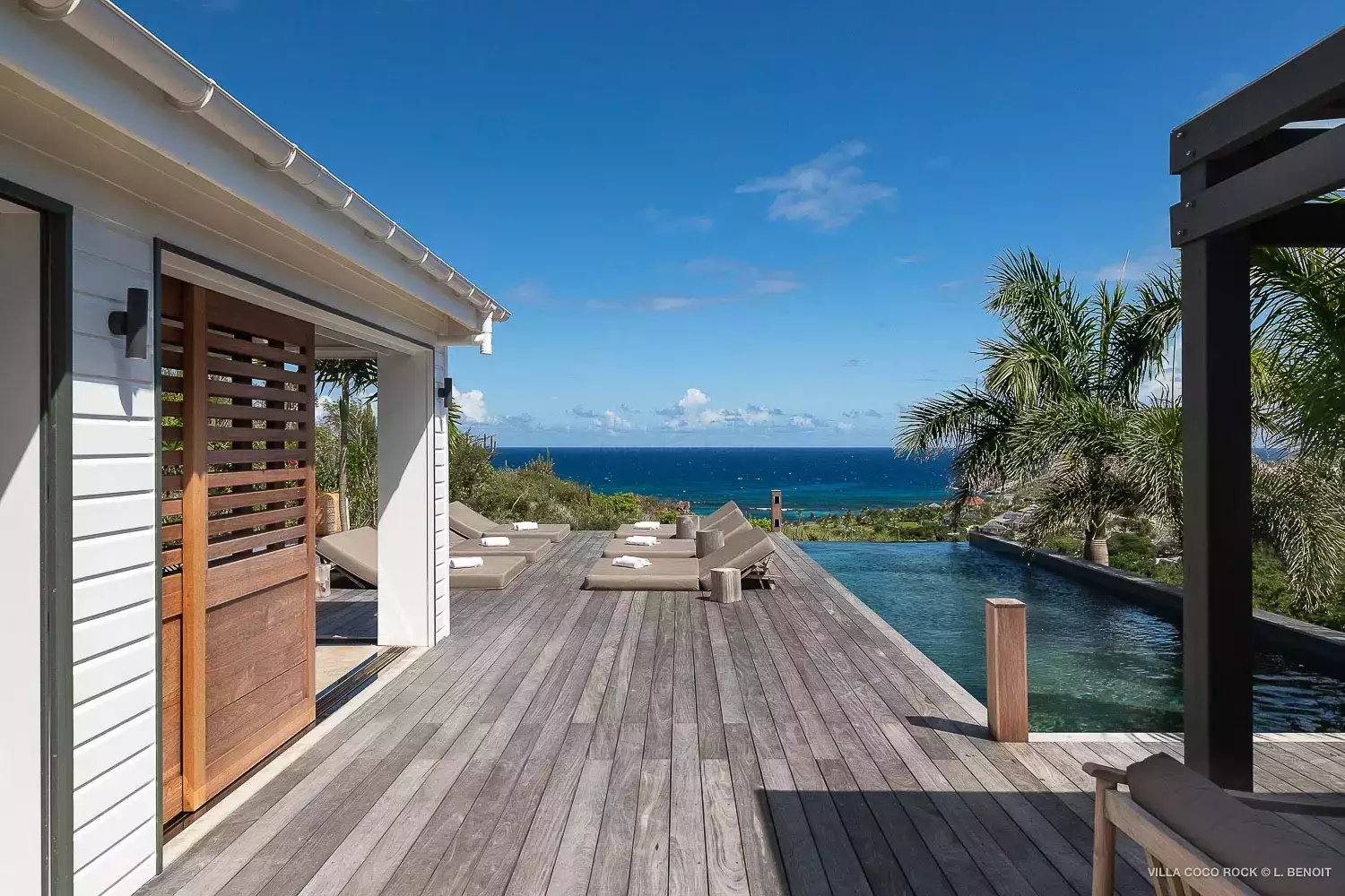 L’espace extérieur de la Villa Coco Rock est un véritable havre de paix, avec une vaste terrasse aménagée, une piscine chauffée et un salon extérieur confortable, offrant une jolie vue sur la mer.