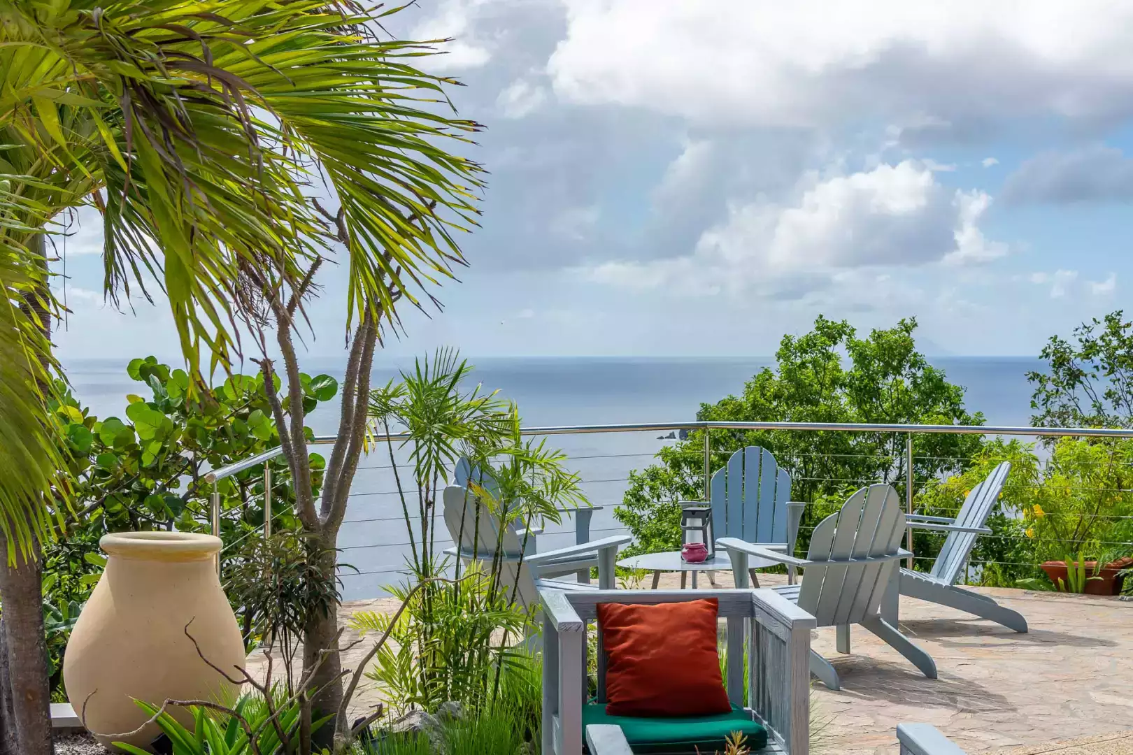 À l’extérieur, la grande terrasse en pierre naturelle surplombe la mer. Vous y trouverez une piscine à débordement, des transats, un coin lounge à l’ombre de la pergola et un espace repas en plein air. L’ensemble est bordé de plantes tropicales, dans une ambiance douce et authentique.